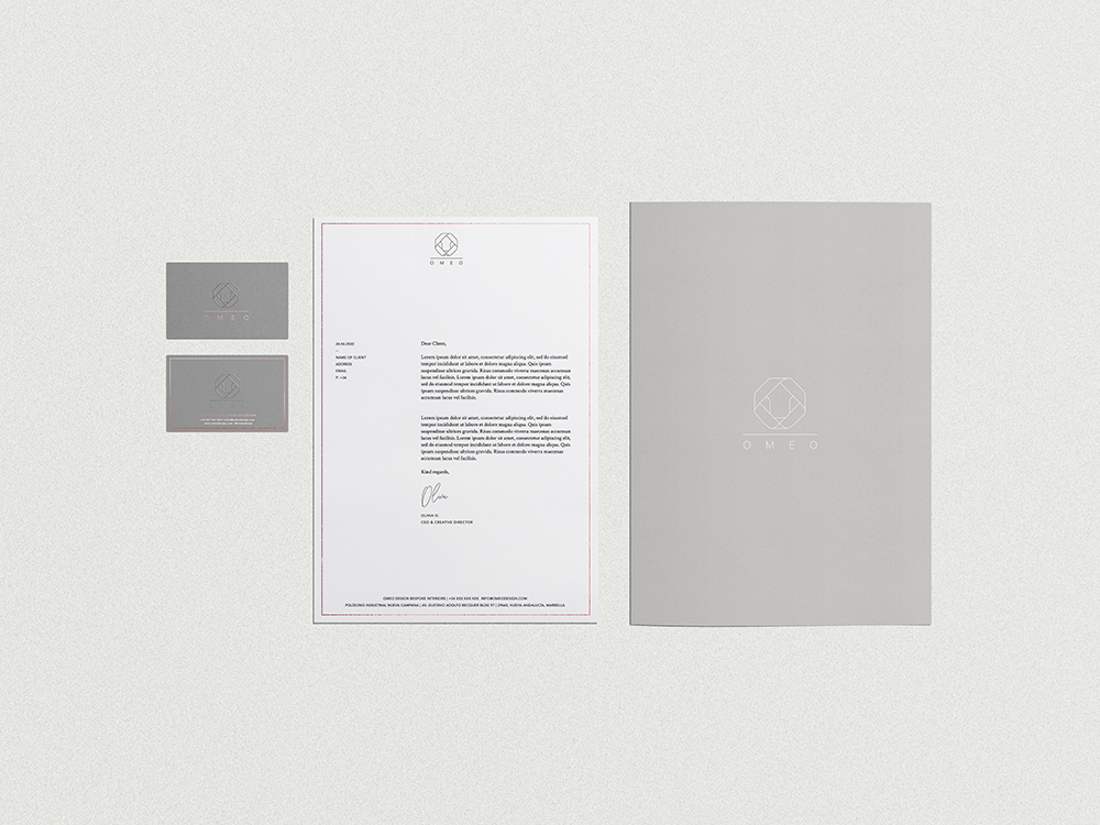 The identity system features a wide spectrum of printed assets and digital applications, including stationery, packaging, templates for communications and portfolios, marketing & advertising, labels and website. All Omeo's corporative material is printed in a selected a bespoke premium grey textured paper.